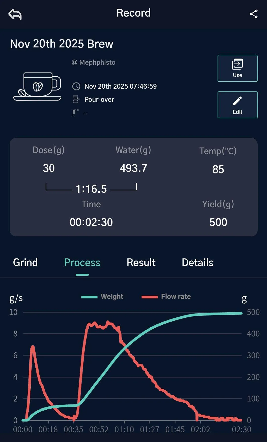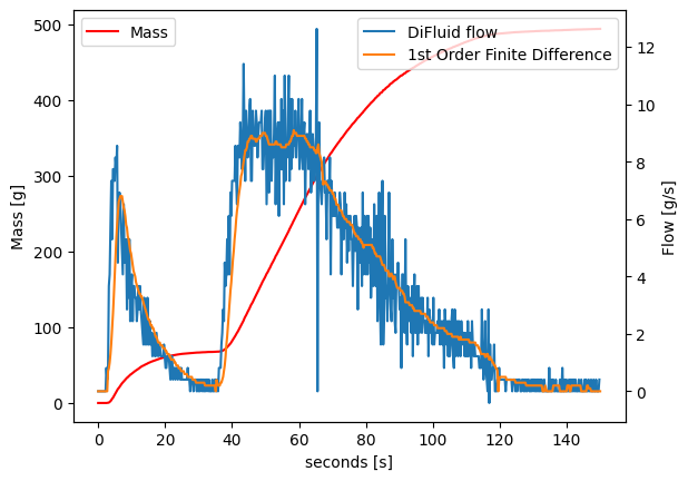 To analyze this result, we need to remember the pouring structure! Beginning from the right side of the graph, the fast 100 g pour brings up the flow, which then decays during the bloom phase. The next fast 200 g pour brings the flow back, and the slow 100g pour maintains it relatively stable. Then the flow decays again during the rundown.